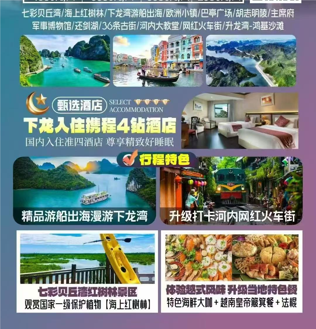 早餐后,前往【歐洲小鎮(zhèn) Megagrandworld】---越南河內(nèi)版水上威尼斯(停留參觀約 30 分鐘),是河內(nèi)的新興網(wǎng)紅拍照打卡點(diǎn),一片五彩斑斕的建筑,就像走進(jìn)了一幅美麗的油畫 中!每座房子都像藝術(shù)品一樣。彩色房子中又包裹著一條小河,小河上還有大帆船,小游船,給這個(gè)小鎮(zhèn)又增添了些生動(dòng)的色彩,街道兩旁還有不少精致的小商店和咖啡館,可以找一家可愛的咖啡店,品嘗一杯越南咖啡,有種身處電影里的高級(jí)感! 游覽河內(nèi); 外觀巴亭廣場(chǎng):是河內(nèi)人民集會(huì)和節(jié)日活動(dòng)的場(chǎng)所; 外觀胡志明陵:胡志明為越南人民尊敬的國(guó)父,每天慕名而來瞻仰的游人不計(jì)其數(shù)。 外觀主席府:主席府是一橦極漂亮的法國(guó)式建筑,在法屬期間, 曾是法駐印度支那總督居住和辦公的地方; 【軍事博物館】館內(nèi)展示的是以越南近代戰(zhàn)爭(zhēng)為基點(diǎn)的軍事歷史,尤其全方位展示了越戰(zhàn)中北越軍隊(duì)和美軍使用過的小型噴火器、炸彈、戰(zhàn)斗機(jī)等武器。 游覽【還劍湖】,自由漫步還劍湖,還劍湖位于河內(nèi)舊城的中心區(qū),被稱為河內(nèi)第一風(fēng)景區(qū),這里匯聚著中越法三國(guó)的文化氣息,中國(guó)的漢字,越南的奧黛,法式的咖啡館和面包,相映成趣,近距離接觸越南街區(qū)文化,更貼越南地氣;走在街上,林蔭大道兩旁有著許多帶有百葉窗和瓦頂?shù)拇u質(zhì)建筑,仿佛向世人講述著這個(gè)城市的歷史。在美麗的還劍湖旁和狹窄的古街上,經(jīng)常可以看到當(dāng)?shù)氐奶厣煌üぞ?/span>-人力三輪車。隨后可以乘坐河內(nèi)特色人力【三輪車】(費(fèi)用自理)(0.5小時(shí));觀賞沿途的風(fēng)景,乘坐著這種人力三輪車慢悠悠地游覽河內(nèi)古街是您認(rèn)識(shí)河內(nèi)的最佳方式。 打卡【三十六條古街】越南河內(nèi)老街最有名的還是屬三十六街,這如同我們匡內(nèi)的古鎮(zhèn)街道,四通八達(dá)又相互交錯(cuò)。每一條街道都承擔(dān)著不同的銷售職能。工藝品一條街、美食一條街、酒吧一條街、服飾一條街.………總之來到三十六街逛上一遍一定能夠滿足一個(gè)越南人所有的日常所需和精神世界的享受。這是一條有著歷史又充滿地道煙火氣息的老街區(qū),如果你想要了解越南人的真實(shí)生活,逛一下三十六街就會(huì)得到答案。 【河內(nèi)大教堂】圣約瑟夫大教堂又名河內(nèi)大教堂,建于1886年的法式風(fēng)格天主教堂,越南規(guī)模最大最有名的法國(guó)天主教堂,同時(shí)也是河內(nèi)很具代表性的法式建筑。雖是仿巴黎圣母院而建,但是彌撒開始,心都靜了,你可以選擇距離不遠(yuǎn)的小攤,來杯滴漏咖啡,在嘈雜中的享受內(nèi)心的寧?kù)o。 【河內(nèi)火車街】來河內(nèi),必打卡火車街呀!狹窄街道兩側(cè)是色彩斑斕的房屋,火車軌道從中穿過。當(dāng)火車緩緩駛來,人群紛紛避讓,那近距離感受火車呼嘯而過的刺激感,伴著街邊小吃的煙火氣,構(gòu)成了一幅獨(dú)特且鮮活的畫面,人們坐在鐵道邊,一邊品嘗咖啡,一邊等待火車經(jīng)過,形成了獨(dú)特的咖啡文化。溫馨提示:此為贈(zèng)送項(xiàng)目,如遇交通管制無(wú)法進(jìn)入游覽,不退費(fèi)用。