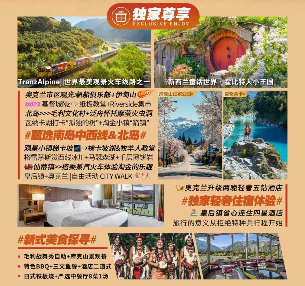 早餐后,游覽以下景點(diǎn): 【懷托摩螢火蟲洞】(參觀約1小時(shí),并享用午餐BBQ)懷托摩螢火蟲洞是3000萬年前形成的石灰?guī)r,于1887年被發(fā)現(xiàn),現(xiàn)在已經(jīng)成為新西蘭很受歡迎的觀光景點(diǎn)之一。差不多45分鐘的觀光行程,沿著美麗壯觀的鐘乳石通道,你將體驗(yàn)到巖洞長(zhǎng)廊中如畫如卷般的鐘乳石奇景以及讓人豁然開朗的巖溶大廳。正贊嘆著大自然的奧妙時(shí),乘坐撐船穿行于螢火蟲洞中的靜河,欣賞頭頂上成千上萬的螢火蟲,猶如銀河系中點(diǎn)點(diǎn)星光在閃爍搖曳,仔細(xì)聆聽輕柔徐緩的滴水聲,才恍然大悟仍置身于深入地底螢火蟲洞的巨大洞穴中,此時(shí)此景,美不勝收。 【毛利文化村】(約1小時(shí))Whakarewarewa - The Living Maori VillageWhakarewarewa原本是一個(gè)毛利族部落,現(xiàn)在以文化村的方式呈現(xiàn)。這個(gè)毛利部落建設(shè)在地?zé)釡厝希麄€(gè)部落到處都是溫泉和地?zé)?。族人?jīng)常利用地?zé)釡厝腼兪澄?。毛利族過著群居生活,部落里的家族們世世代代生活在這里,游客可參觀部落的房子和教堂。景點(diǎn)內(nèi)還可以看到Te Puia景區(qū)內(nèi)的噴泉,其中噴發(fā)最頻繁的平均45分鐘左右噴發(fā)一次,持續(xù)時(shí)間約為10分鐘左右。 晚餐升級(jí):毛利歌舞秀+酒店自助餐 晚上來到酒店餐廳,在熱情洋溢的毛利歡迎儀式后,進(jìn)入餐廳,享用豐盛的自助大餐,觀看地道毛利歌舞秀。晚餐后,入住酒店休息。 | |||