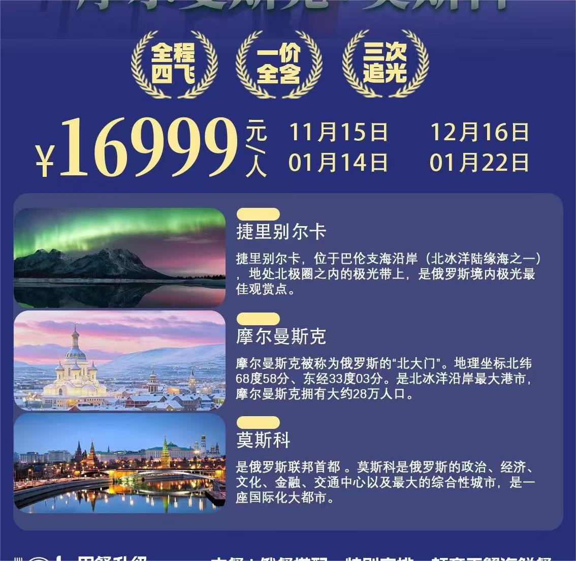 抵達(dá)摩爾曼斯克之后導(dǎo)游接站開始游覽: 【阿廖沙雕像】(外觀約20分鐘)游客可以欣賞不凍港的美景,此地迷霧繚繞,猶如仙境。這是全俄第二高的大雕塑,為了紀(jì)念二戰(zhàn)的蘇聯(lián)士兵而建,氣勢(shì)非常宏偉,阿廖沙雕像下的火是長(zhǎng)年不熄滅的。 【摩爾曼斯克北極圈標(biāo)志紀(jì)念碑】(外觀約 20 分鐘)紀(jì)念碑上標(biāo)著經(jīng)緯度68°58′N 33° 03′。這標(biāo)志著該城已深入北極圈300多千米。城市的經(jīng)緯度坐標(biāo)紀(jì)念碑是個(gè)非常有紀(jì)念意義的打卡地點(diǎn)。 【燈塔紀(jì)念碑】(外觀約 10 分鐘)燈塔紀(jì)念碑是為了紀(jì)念失蹤船員而建,其中包括2000年在巴倫支海沉沒的“庫爾斯克”核潛艇上的全部118名船員。 【晚餐特別安排品嘗帝王蟹】 晚餐后,第一次【追尋極光】(約3-5小時(shí)),注:根據(jù)天氣和氣候而定,不保證100%能看到極光。 |