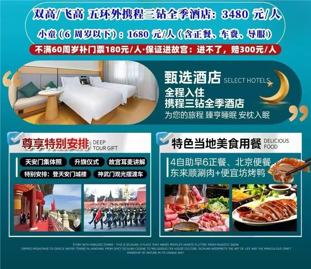 游覽景點(diǎn):天安門廣場(chǎng)(游覽約1小時(shí)) 前往天安門廣場(chǎng),傾聽(tīng)祖國(guó)心臟的脈搏,目睹壯觀的“天安麗日”景觀,瞻仰毛主席遺容——【毛主席紀(jì)念堂】(每日限流如遇未預(yù)約到門票或者政策性閉館時(shí),改觀外景),觀雄偉的【人民英雄紀(jì)念碑】,外觀【人民大會(huì)堂】,游覽景點(diǎn):天安門城樓(游覽約1小時(shí)如未預(yù)約成功改為景山公園) 遙想新中國(guó)的建立、抗戰(zhàn)勝利80周年閱兵場(chǎng)景。 游覽景點(diǎn):故宮博物院(放慢腳步,留足3小時(shí)), 故宮是中國(guó)明清兩代的皇家宮殿,舊稱紫禁城。這里曾居住過(guò)24個(gè)皇帝,是世界上現(xiàn)存規(guī)模最大、保存最為完整的木質(zhì)結(jié)構(gòu)古建筑之一。走近全新開(kāi)放的《還珠格格》皇太后居住的慈寧宮、《甄嬛傳》熹妃娘娘居住的壽康宮,感受皇家萬(wàn)千氣象。 游覽景點(diǎn):天壇公園(含小門票)(游覽約1小時(shí)) 天壇是明清兩代皇帝祭祀天地之神和祈禱五谷豐收的地方。被認(rèn)為是現(xiàn)存的一組最精致,最美麗的古建筑群。天壇以嚴(yán)謹(jǐn)?shù)慕ㄖ季?、奇特的建筑?gòu)造和瑰麗的建筑裝飾著稱于世。 溫馨提示: 1、故宮每日限流3萬(wàn)人,門票常年緊張,若您近期打算出游,請(qǐng)盡早下單,以免門票售罄無(wú)法參觀。 2、故宮門票提前7天晚上8點(diǎn)開(kāi)售,我們將在第一時(shí)間為您預(yù)約購(gòu)票,盡量搶票。 若實(shí)在無(wú)法搶到故宮門票,最 晚提前一天通知您:【全額退還故宮門票,免費(fèi)贈(zèng)送:景山公園,登高俯瞰故宮全貌】。如您介意,請(qǐng)報(bào)名時(shí)與接待人員說(shuō)明清楚。行程游覽順序可能會(huì)根據(jù)故宮門票搶到的日期進(jìn)行調(diào)整,請(qǐng)您理解。 3、故宮游覽時(shí)間較長(zhǎng),本日午餐時(shí)間較晚,建議自備一些點(diǎn)心和零食充饑。 |