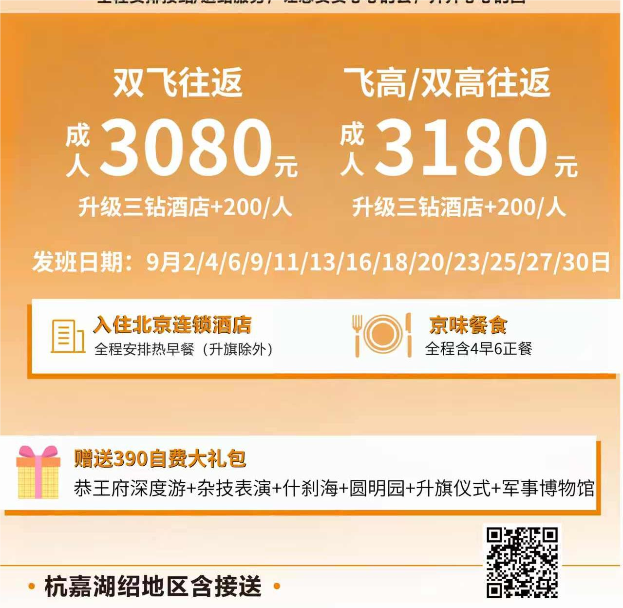請各位游客攜帶本人身份證件,來到美麗的首都北京。接站/接機之后前往酒店入住,當天沒有行程,自由活動。 溫馨提示: 1、您的導游會在您出發(fā)前一天20點前聯(lián)系您,并提示您游覽注意事項,請注意查收短信或接聽電話。(如超過21點沒有接到通知,請您及時致電報名旅行社,謝謝?。?/span> 2、抵達北京后請保持報名時所留的手機號碼暢通,接站師傅根據(jù)您的到達時間與聯(lián)系您。 3、因各地區(qū)出發(fā)時間不一致,有可能出現(xiàn)接機和接站等待的情況(不超過40分鐘),敬請諒解。 4、前往酒店后,請到前臺辦理入住手續(xù),請您自理入住酒店時的押金。如有疑問可咨詢酒店前臺或致電導游。 行程景點用餐游覽順序可能因北京交通、景區(qū)政策、天氣等情況進行調(diào)整,請您理解。 天安門升旗 毛主席紀念堂 | |||